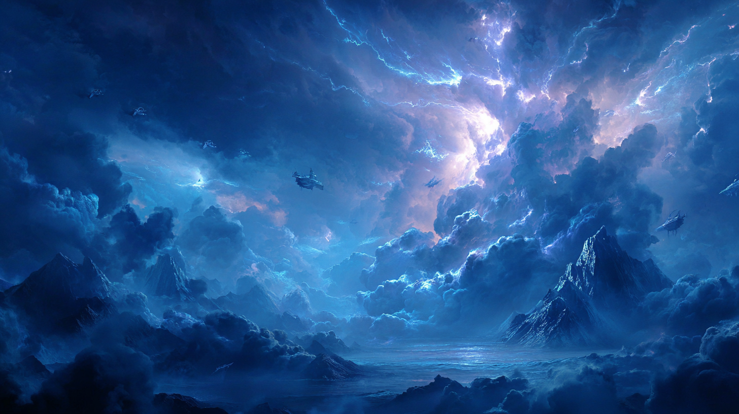 The great ships step off in staggered ranks, teeth against the storm. Gunships rake the cloudflanks, seeding countercharge, their engines humming to disguise fear as melody. We do not fight the storm. We negotiate it.