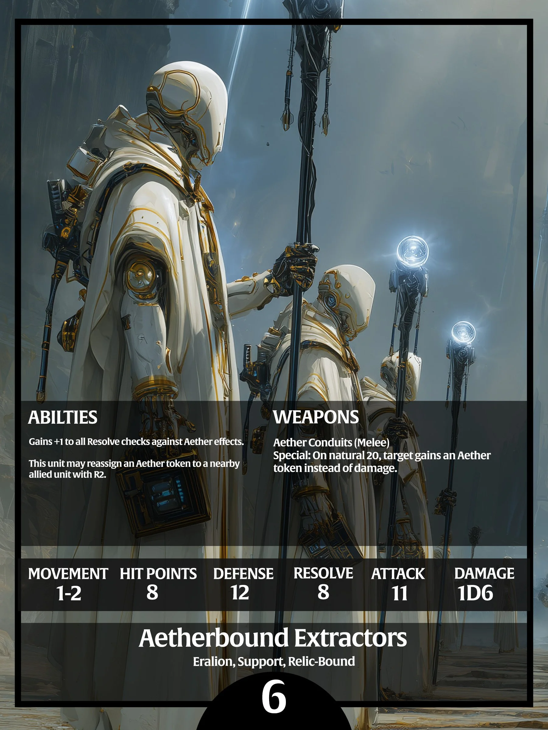 On the battlefield, Aetherbound Extractors function as mystical support units that accelerate the Aether’s influence on the game. Their Harvest Aether ability allows them to increase the Aether Counter each round, fueling relics, surges, and faction-specific abilities faster than normal. Through Release Flow, they can rapidly spike Aether levels to trigger Wild Surges — a risky but devastating tool in the right hands. Fragile and lightly armed, they rely on positioning and protection rather than brute force. When left unchecked, however, they become game-changing catalysts, twisting the flow of battle in ways even their allies may not predict. Extractors reward bold players who embrace risk and volatility, wielding chaos itself as a weapon — or as a warning.